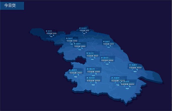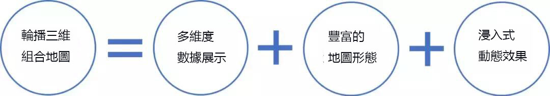 我們可以看出,圖中以多種地圖形態展示了四個維度的資料,既體現了資料價值,也實現了炫酷的動態效果。
